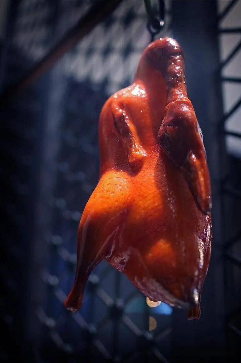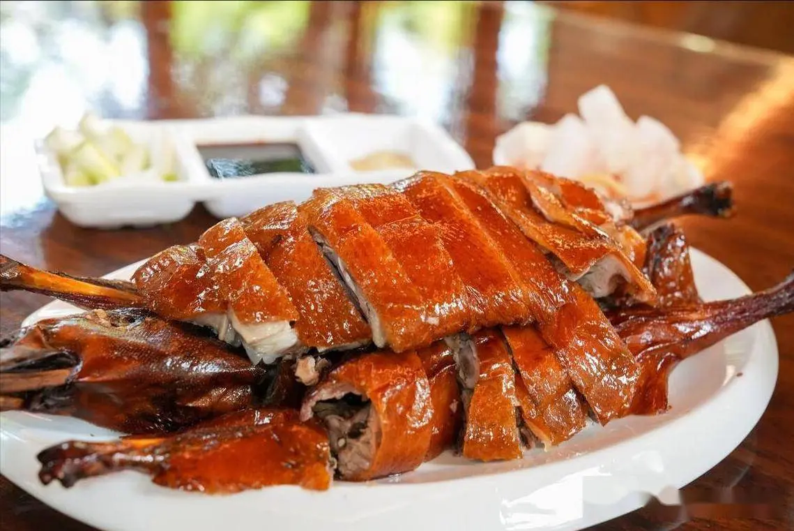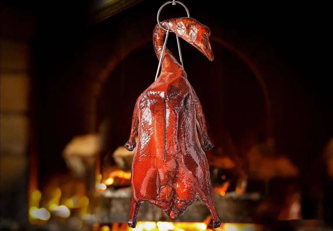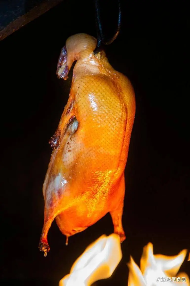 果木独特的馥郁香气,丝丝缕缕沁入鸭肉纹理,随着时间推移,鸭皮渐呈金黄透亮之色,滋滋冒油,宛如琥珀流金;鸭肉鲜嫩多汁,入口即化,脂香与肉香完美交融,于舌尖上演绎一场味觉的绮丽盛宴。